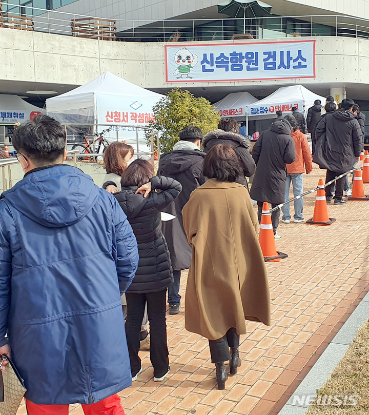 [광주=뉴시스] 류형근 기자 = 코로나19 오미크론 변이바이러스 급증으로 광주지역 검사방식이 고위험군 중심으로 변경된 26일 오전 광주 서구 선별진료소 옆에 설치된 '신속항원검사소'에서 검사자들이 자가검사키트를 이용해 스스로 검사를 하기 위해 기다리고 있다. 2022.01.26. [email protected]