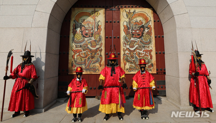 [서울=뉴시스] 이영환 기자 = 26일 오후 서울 종로구 광화문에서 열린 '경복궁 수문장, 광화문에 문배도를 걸다'에서 호랑이띠 어린이들이 수문장과 함께 포즈를 취하고 있다. 2022.01.26. [email protected]