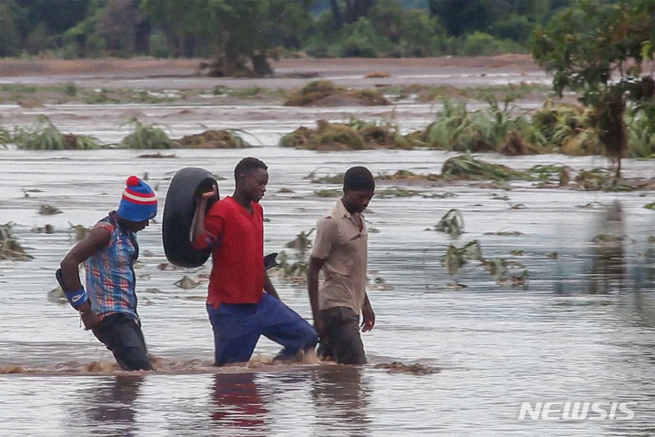 [치콰와=AP/뉴시스] 25일(현지시간) 말라위 치콰와에서 주민들이 홍수로 침수된 도로를 건너고 있다. 모잠비크, 마다가스카르, 말라위는 열대성 폭풍 애나와 남부 아프리카 전역에 일주일 이상 계속된 폭우로 인한 사망자와 피해를 집계하고 있다. 2022.01.27.
