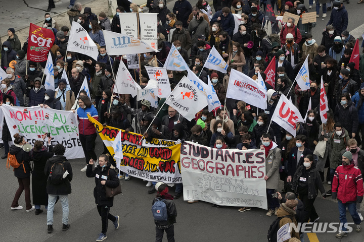 [파리=AP/뉴시스] 27일(현지시간) 프랑스 파리에서 임금인상 요구 시위가 열려 노동자, 학생들을 비롯한 시위대가 행진하고 있다. 치솟는 생활비에 항의하는 다양한 직업군의 노동자들이 프랑스 전역에서 임금 인상 요구 시위를 벌일 예정이다. 2022.01.28.