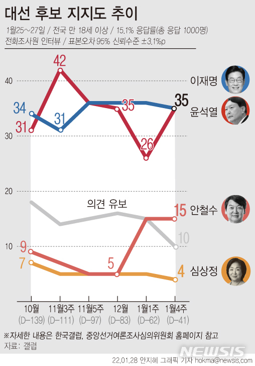 [서울=뉴시스] 한국갤럽의 1월 넷째주 정례 여론조사에 따르면, '누가 다음 대통령이 되는 게 가장 좋다고 생각하느냐'고 물은 결과 이재명 민주당 후보와 윤석열 국민의힘 후보가 35%로 동률을 이뤘다. 이어 안철수 국민의당 후보 15%, 심상정 정의당 후보 4% 순이었다. '그 외 인물'은 1%, 의견 유보는 10%였다. (그래픽=안지혜 기자)