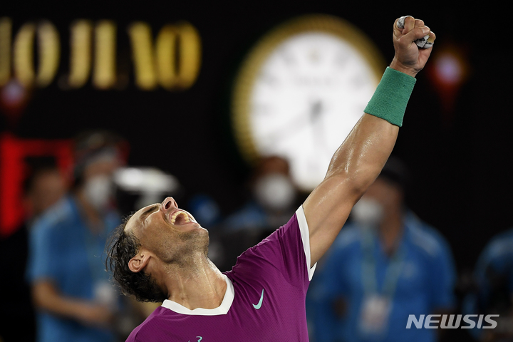 [멜버른=AP/뉴시스] 라파엘 나달(5위·스페인)이 28일(현지시간 호주 멜버른에서 열리고 있는 호주오픈 남자 단식 준결승전에서 마테오 베레티니(7위·이탈리아)를 물리치고 기뻐하고 있다. 나달은 베레티니를 세트 스코어 3-1(6-3 6-2 3-6 6-3)로 꺾고 결승에 올라 그랜드 슬램 최다 우승(21회)을 노린다. 2022.01.28.