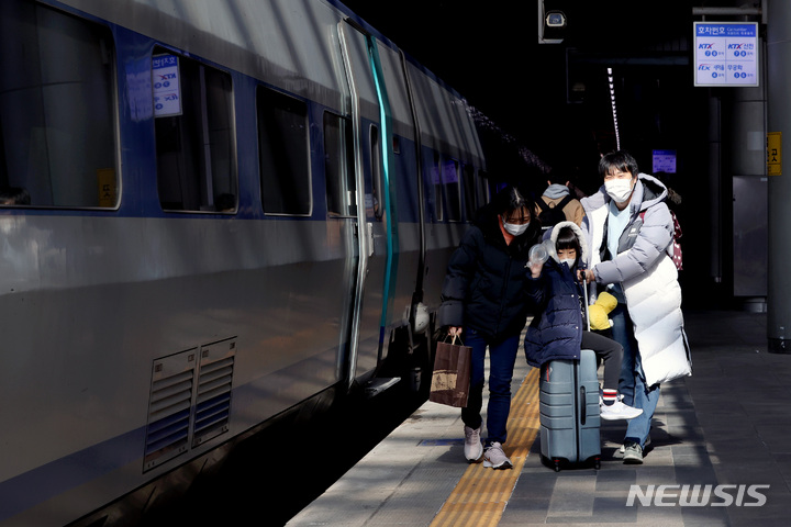 [서울=뉴시스] 김병문 기자 = 설 명절 연휴를 하루 앞둔 28일 오후 서울 용산구 서울역에서 한 가족이 귀성길에 오르고 있다. 2022.01.28. [email protected]