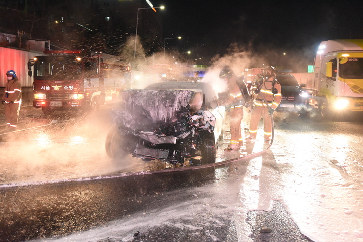 [서울=뉴시스] 조수정 기자 = 설 연휴 첫날인 29일 새벽 3시 42분께 경인고속도로 서울 신월IC 부근 700m 전 인천에서 서울방향으로 주행하던 승용차가 앞서가던 덤프트럭 후미를 충돌하며 화재가 발생, 소방대원들이 진화하고 있다. 화재는 오전 4시 20분께 완진됐다.  (사진=양천소방서 제공) 2022.01.29. [email protected]