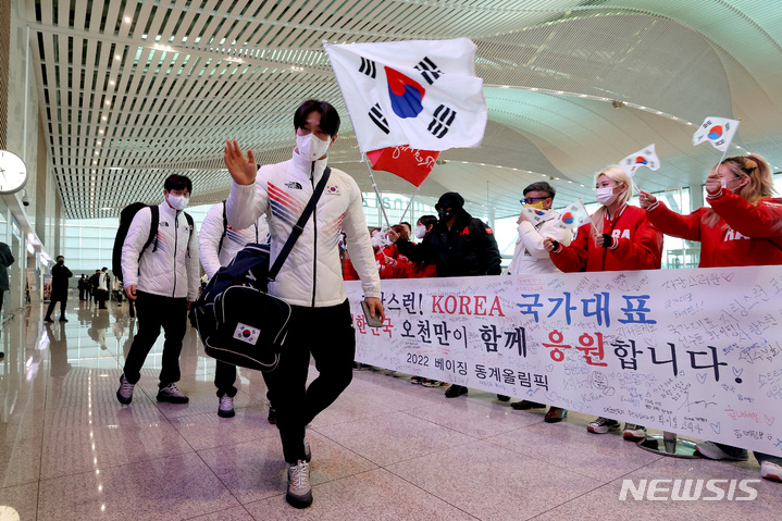 [인천공항=뉴시스] 김병문 기자 = 2022 베이징 동계올림픽 대한민국 선수단 본진이 31일 오전 인천공항 제2여객터미널에서 중국 베이징으로 출국하고 있다. 2022.01.31. [email protected]