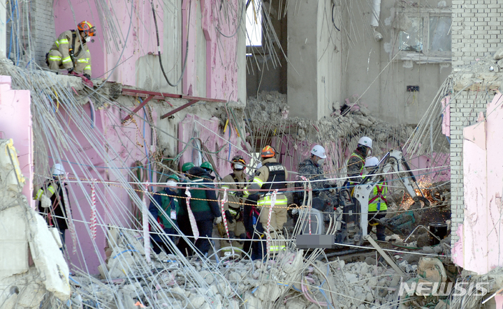 [광주=뉴시스] 류형근 기자 = 광주 서구 화정동 현대산업개발 신축 아파트 붕괴 사고 21일째인 31일 오전 소방대원과 작업자들이 굴삭기 등을 이용해 실종자 수색작업을 하고 있다. 2022.01.31. [email protected]