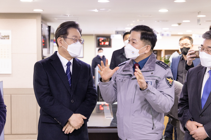 [서울=뉴시스] 전신 기자 = 이재명 더불어민주당 대선 후보가 31일 서울 종로구 서울경찰청 112 종합상황실을 방문해 최관호 서울경찰청장으로부터 상황실 관련 설명을 듣고 있다. (사진=더불어민주당 선대위 제공) 2022.01.31. [email protected] *재판매 및 DB 금지