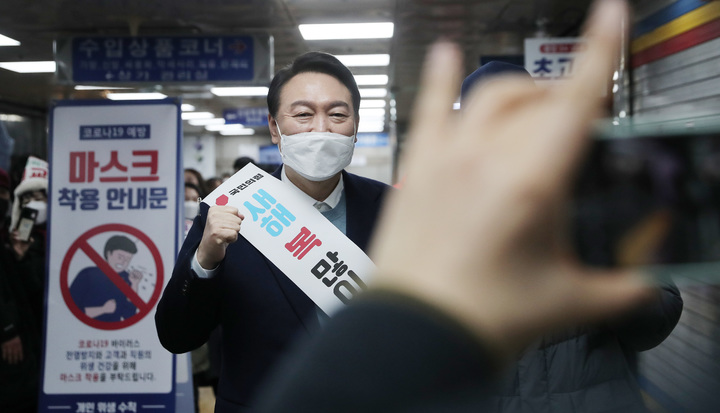 [서울=뉴시스] 전신 기자 = 윤석열 국민의힘 대선 후보가 31일 안양역 일대에서 설을 맞아 시민들에게 새해 인사를 하며 기념촬영하고 있다. (사진=국민의힘 선대본 제공) 2022.01.31. [email protected] *재판매 및 DB 금지