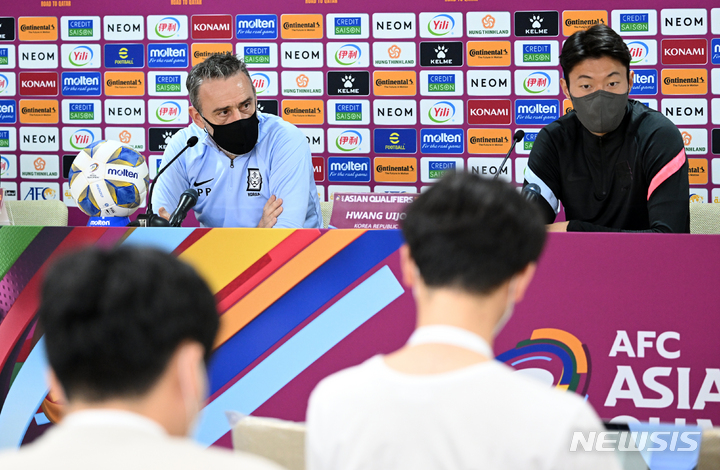 [두바이(아랍에미리트)=뉴시스] 배훈식 기자 = 파울루 벤투(왼쪽) 대한민국 축구 국가대표팀 감독과 황의조가 31일 오후 아랍에미리트 두바이 라쉬드 스타디움에서 2022 카타르 월드컵 최종예선 시리아 전을 앞두고 기자회견을 하고 있다. 2022.01.31. [email protected]