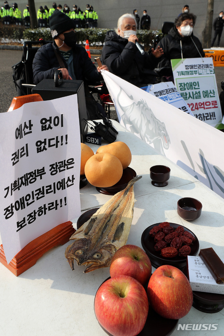 [서울=뉴시스] 백동현 기자 = 전국장애인차별철폐연대 회원들이 1일 오전 서울 마포구에 위치한 홍남기 기획재정부 장관 자택 앞에서 '기획재정부 장애인권리예산 보장 기원 설날 차례상' 집회를 열고 있다. 2022.02.01. [email protected]