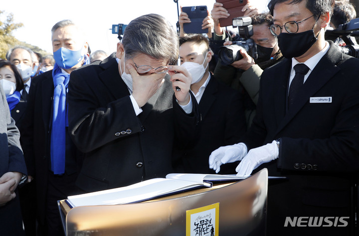[김해=뉴시스] 최동준 기자 = 이재명 더불어민주당 대선 후보가 6일 경남 김해 봉하마을 노무현 전 대통령 묘역을 방문해 참배를 마치고 방명록 작성 전 눈물을 흘리고 있다. 2022.02.06. [email protected]