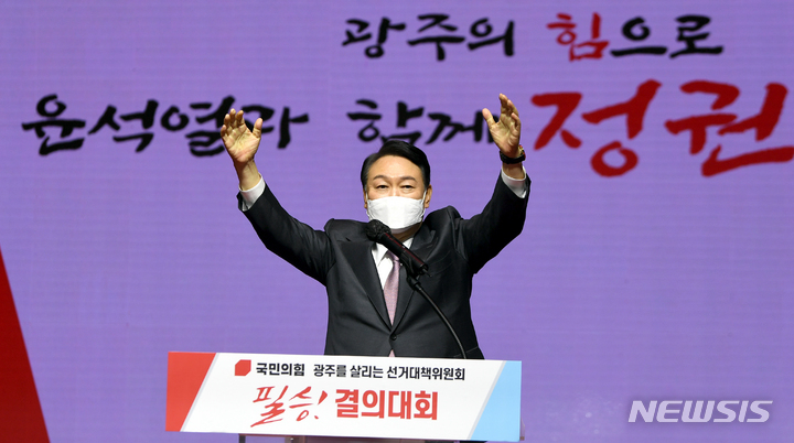 [광주=뉴시스] 류형근 기자 = 윤석열 국민의힘 대선후보가 6일 오후 광주 서구 김대중컨벤션센터에서 열린 '광주를 살리는 선거대책위원회 필승 결의대회'에 참석해 두손을 들어보이며 승리를 다짐하고 있다. 2022.02.06. [email protected]