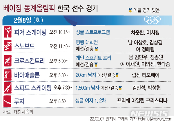 [그래픽] 베이징 동계올림픽 한국 선수 경기 (8일)
