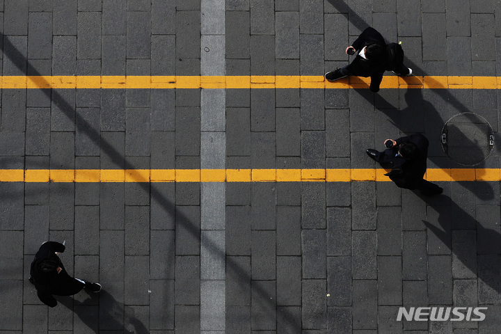 [서울=뉴시스] 백동현 기자 = 현행 사회적 거리두기가 2주 더 연장된 7일 오후 서울 영등포구 여의도역 인근에서 시민들이 이동하고 있다. 접종 여부와 관계없이 사적모임은 6인까지, 식당·카페 등의 영업시간은 오후 9시까지 제한되는 거리두기는 오는 20일까지 유지된다. 2022.02.07. [email protected]