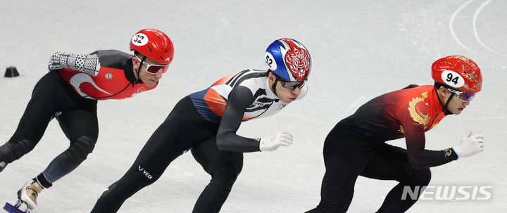 [베이징(중국)=뉴시스] 고범준 기자 = 7일 오후 중국 베이징 캐피털 실내경기장에서 열린 2022 베이징 동계올림픽 쇼트트랙 남자 1000m 준결승, 한국 황대헌이 질주하고 있다. 2022.02.07. [email protected]
