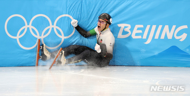 [베이징(중국)=뉴시스] 고범준 기자 = 7일 오후 중국 베이징 캐피털 실내경기장에서 열린 2022 베이징 동계올림픽 쇼트트랙 남자 1000m 결승 경기, 결승선 앞에서 헝가리 리우 샤오린 산도르가 중국 런쯔웨이의 견제를 받아 넘어지고 있다. 2022.02.07. [email protected]