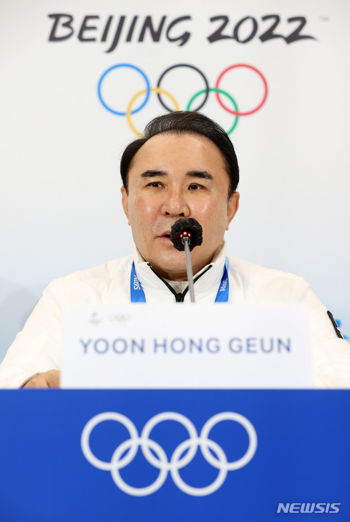[베이징(중국)=뉴시스] 홍효식 기자 = 8일 오전 중국 베이징 메인미디어센터(MMC)에서 열린 쇼트트랙 남자 1000M 준결승 편파판정에 대한 긴급 기자회견에서 윤홍근 선수단장이 발언하고 있다. 대한민국 선수단은 편파판정 관련 국제스포츠중재재판소(CAS)에 제소할 예정이다. 2022.02.08. [email protected]