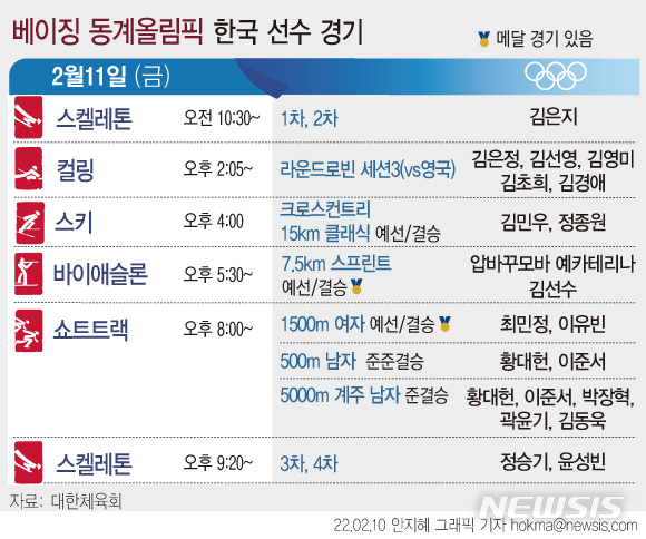 [그래픽] 베이징 동계올림픽 한국 선수 경기 (11일)