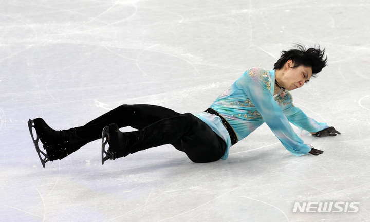 [베이징(중국)=뉴시스] 고범준 기자 = 일본의 하뉴 유즈루가 10일 중국 베이징 캐피털 실내경기장에서 열린 2022 베이징 동계올림픽 피겨 스케이팅 남자 싱글 프리 스케이팅에 출전해 연기를 하던 중 넘어지고 있다. 2022.02.10. [email protected]