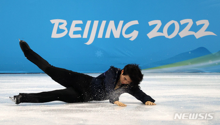 [베이징(중국)=뉴시스] 고범준 기자 = 차준환이 10일 중국 베이징 캐피털 실내경기장에서 열린 2022 베이징 동계올림픽 피겨 스케이팅 남자 싱글 프리 스케이팅에 출전해 연기를 하던중 넘어지고 있다. 2022.02.10. [email protected]