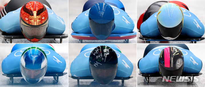 [베이징(중국)=뉴시스] 홍효식 기자 = 11일 중국 베이징 옌칭 국립 슬라이딩 센터에서 열린 2022 베이징 동계올림픽 남자 스켈레톤 3차 레이스에서 각 국 대표 선수들이 다양한 헬멧을 쓰고 주행하고 있다. 2022.02.11. [email protected]