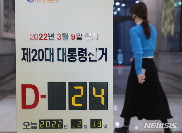 [과천=뉴시스] 국회사진기자단 = 제20대 대통령 후보자 등록 첫날인 13일 과천 중앙선관위 로비에 D-24가 안내되고 있다. 2022.02.13. [email protected]