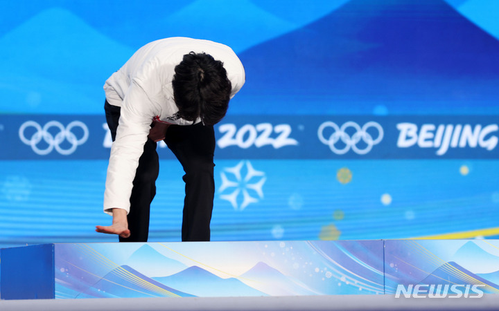[베이징(중국)=뉴시스] 홍효식 기자 = 스피드 스케이팅 차민규가 12일 오후 중국 베이징 메달 플라자에서 열린 스피드 스케이팅 남자 500m 메달 세리머니에서 시상대를 오르기 전 바닥을 닦고 있다. 2022.02.12. [email protected]