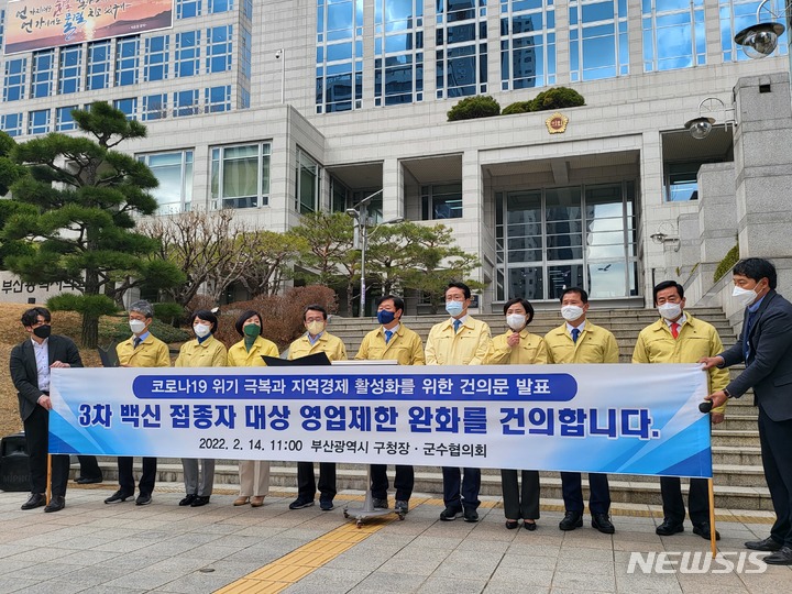 [부산=뉴시스] 이동민 기자=14일 오전 부산시의회 앞에서 부산시 구청장군수협의회가 모여 '백신3차 접종자 대상 소상공인 영업제한 완화 건의문'을 발표하고 있다. (사진 왼쪽부터 이성문 연제구청장, 정미영 금정구청장, 정명희 북구청장, 강성태 수영구청장, 김우룡 동래구청장, 박재범 남구구청장, 서은숙 부산진구청장, 최형욱 동구청장, 최진봉 중구구청장) 2022.02.14. [email protected]
