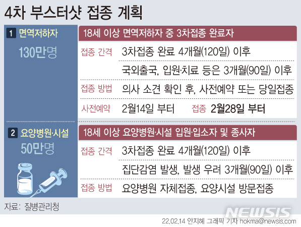 [서울=뉴시스] 14일부터 면역저하자와 요양병원·시설 입원·입소자 등을 대상으로 코로나19 백신 4차 접종이 이뤄진다. 이번 4차 접종은 화이자와 모더나 등 mRNA 백신을 활용한다. (그래픽=안지혜 기자)