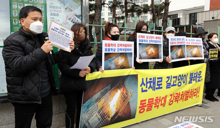 [서울=뉴시스] 이영환 기자 = 한국동물보호연합 등 동물단체 회원들이 14일 오후 서울 마포경찰서 앞에서 한 커뮤니티에 올라온 산 채로 길고양이를 불태우는 등 동물학대를 저지른 사람들에 대한 강력처벌 촉구를 하고 있다.2022.02.14. [email protected]