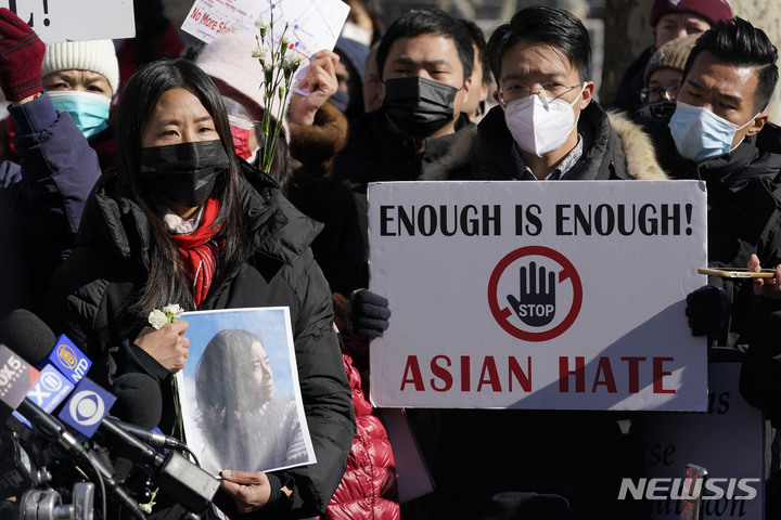 [뉴욕=AP/뉴시스] 14일(현지시간) 미국 뉴욕의 차이나타운 구역에서 주민들이 한국계 여성 피살사건과 관련해 아시안 증오 범죄 중단을 외치며 시위하고 있다. 경찰은 용의자가 13일 새벽 택시에서 내린 피해자를 집까지 쫓아가 흉기로 살해했으며 이후 현장에서 체포됐다고 밝혔다. 2022.02.15.