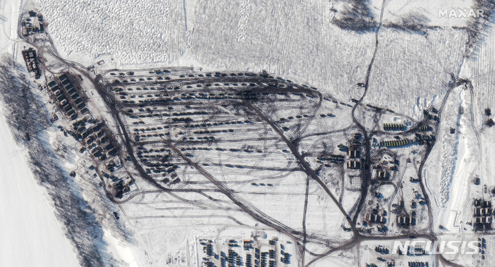 [솔로티=AP/뉴시스] 막서 테크놀로지가 제공한 위성 사진에 13일(현지시간) 우크라이나와의 국경 동쪽에 있는 러시아 솔로티 주둔지에 러시아 군 병력이 주둔해 있다. 2022.02.15.