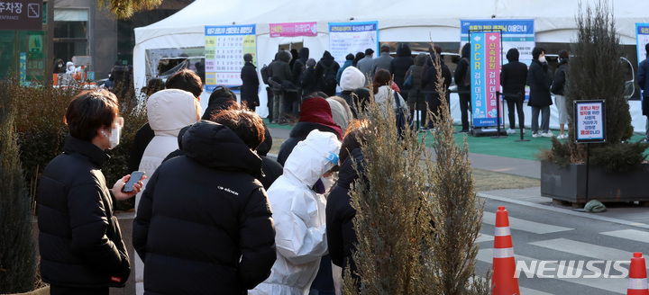 [서울=뉴시스] 이영환 기자 = 0시 기준 코로나19 신규확진자가 9만443명 발생한 16일 오전 서울 송파구보건소 선별진료소를 찾은 시민들이 신속항원검사와 PCR검사를 받기 위해 대기하고 있다. 2022.02.16. [email protected]