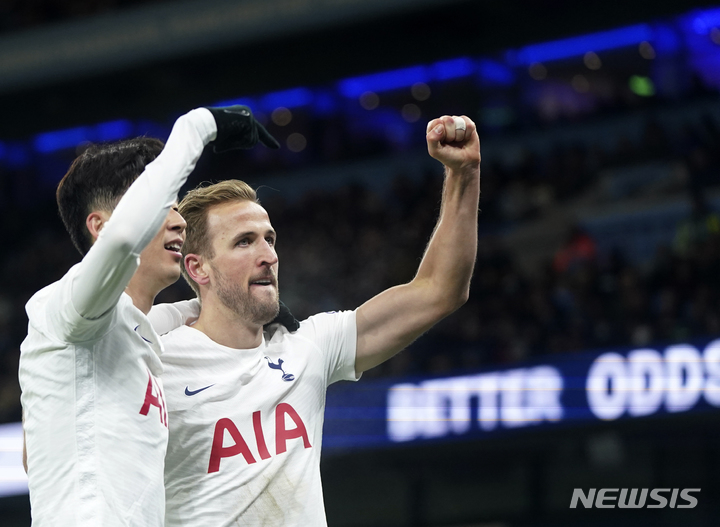 [맨체스터=AP/뉴시스] 토트넘 홋스퍼의 손흥민(왼쪽)이 19일(현지시간) 영국 맨체스터의 에티하드 스타디움에서 열린 2021~22시즌 잉글랜드 프리미어리그(EPL) 26라운드 맨체스터와의 경기에 선발 출전해 자신의 도움으로 골을 넣은 해리 케인과 기쁨을 나누고 있다. 손흥민은 2개의 도움을 기록했고 토트넘은 케인의 멀티 골과 데얀 클루세브스키의 1골 1도움 활약으로 맨시티를 3-2로 꺾었다. 2022.02.20.