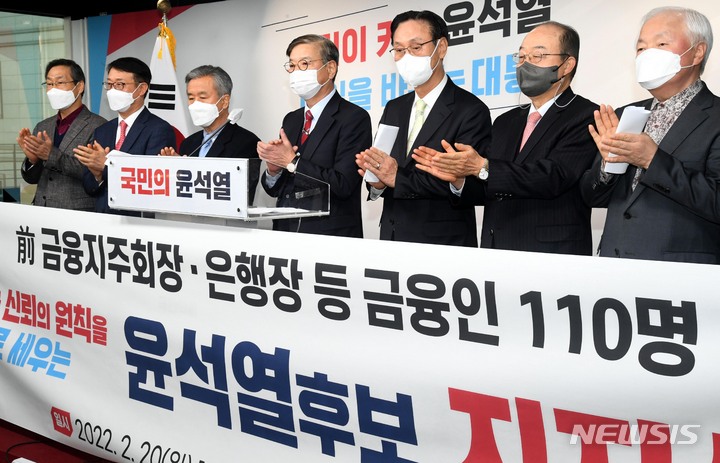 [서울=뉴시스] 김선웅 기자 = 황영기 前 금융투자협회장 등 금융인들이 20일 오전 서울 여의도 국민의힘 중앙당사에서 윤석열 대선 후보 지지 기자회견을 하고 있다. (공동취재사진) 2022.02.20. [email protected]