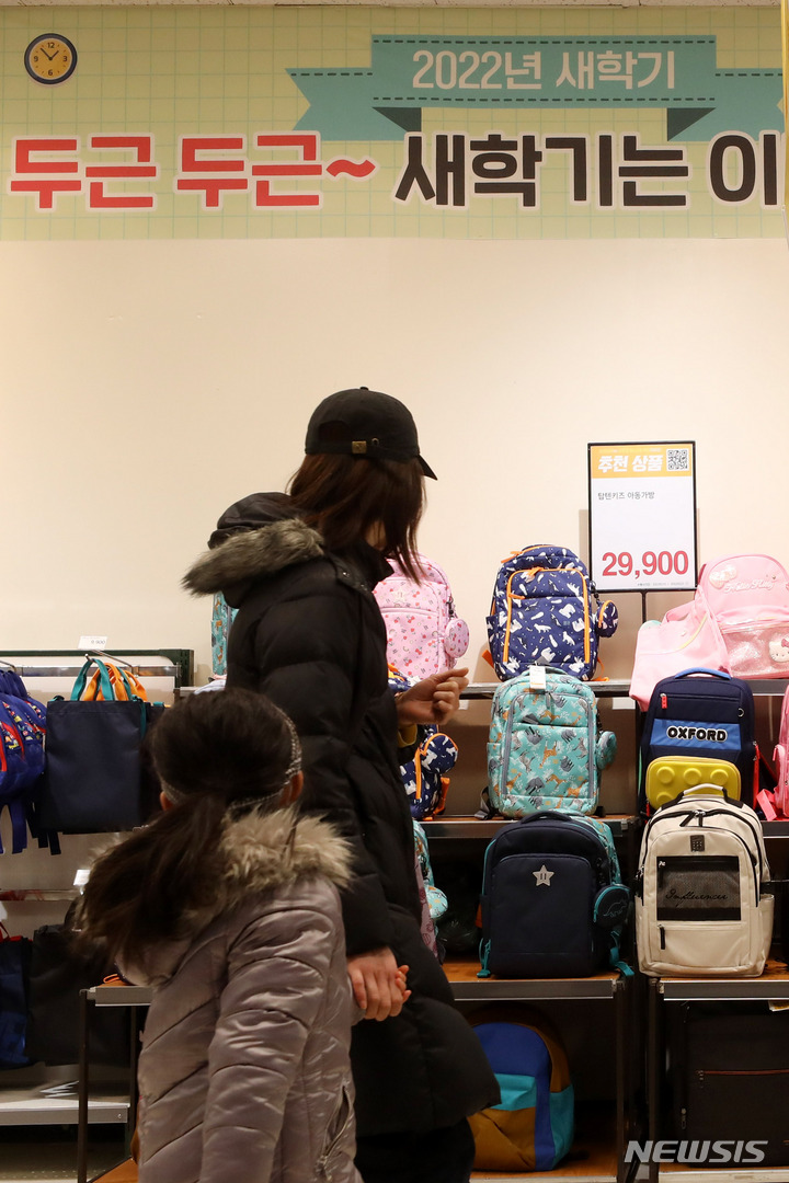 [서울=뉴시스] 추상철 기자 = 신학기 앞두고 책가방의 매출이 증가하고 있는 20일 오후 서울의 한 대형마트에 책가방이 진열돼 있다. 2022.02.20. [email protected]