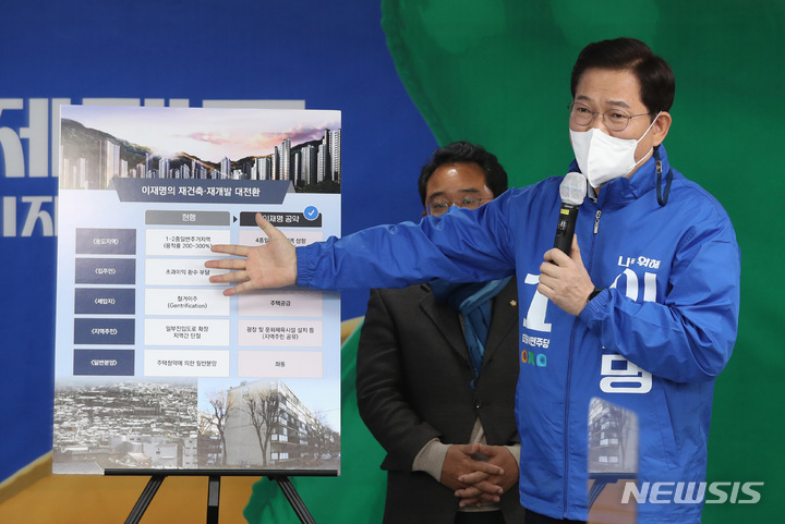 [서울=뉴시스] 김선웅 기자 = 송영길 더불어민주당 상임선대위원장이 20일 서울 여의도 더불어민주당 중앙당사에서 서울 내곡동 청년주택 5만호 공급 등 수도권 부동산 추가공급 정책을 발표하고 있다. (공동취재사진) 2022.02.20. [email protected]