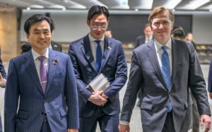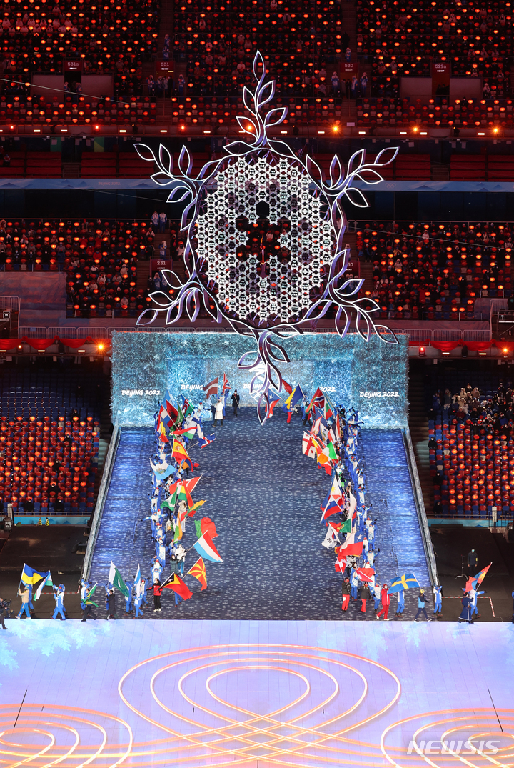 [베이징(중국)=뉴시스] 고범준 기자 = 20일 오후 중국 베이징 국립 경기장에서 열린 2022 베이징 동계 올림픽 폐막식에서 대한민국 스피드스케이팅 은메달리스트 차민규 등 각국 선수단 대표가 국기를 들고 입장하고 있다. 2022.02.20. [email protected]