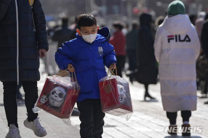 [베이징=AP/뉴시스] 21일 중국 베이징에 있는 올림픽 공식 기념품 판매점에서 올림픽 마스코트 '빙둔둔'을 산 한 어린이가 빙둔둔을 사려 줄 선 사람들 옆을 지나 돌아가고 있다. 2022 베이징 동계올림픽은 끝났지만 빙둔둔의 인기는 여전한 것으로 나타났다. 2022.02.21.