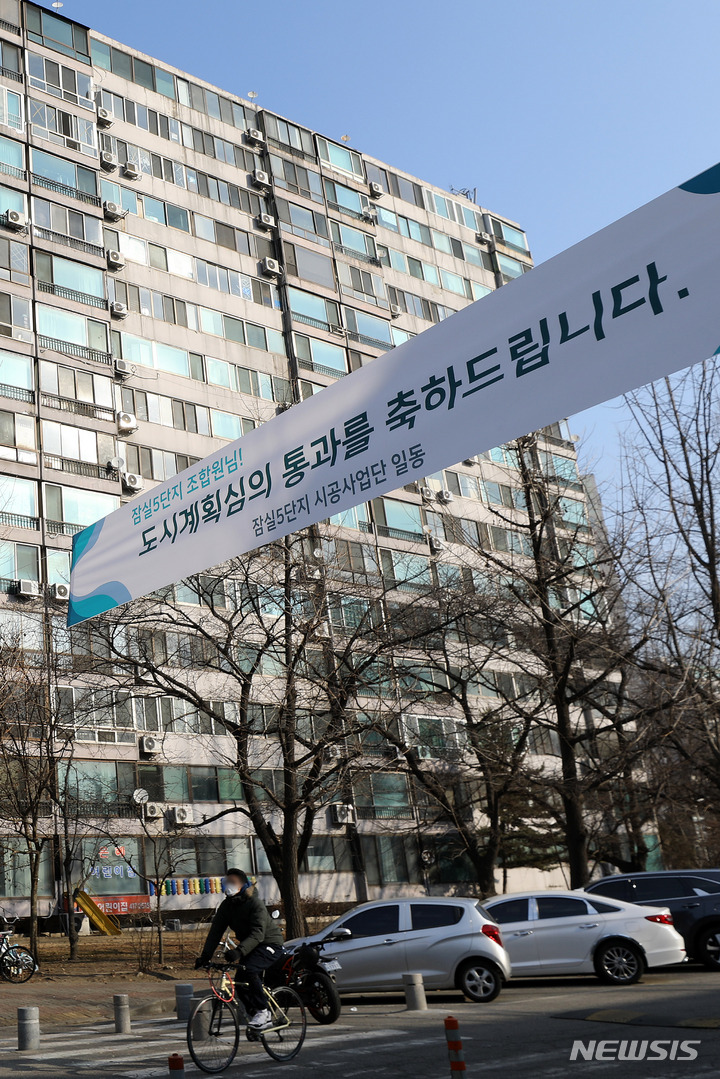 [서울=뉴시스] 백동현 기자 = 21일 오전 서울 송파구 잠실 주공 5단지 아파트 단지 내에 '재건축 심의 통과' 축하 현수막이 걸려있다. 지난 16일 서울시에 따르면 도시계획위원회 수권소위원회가 잠실 주공 5단지의 정비계획안을 심의, 통과시켰다고 밝혔다. 2022.02.21. [email protected]