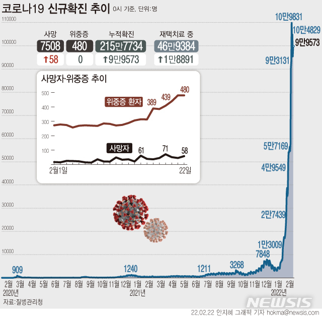 [서울=뉴시스] 22일 0시 기준 신규 코로나19 확진자 수는 9만9573명이다. 국내발생은 9만9444명, 129명은 해외 유입 사례다. 사망자는 58명 늘어 누적 7508명이다. (그래픽=안지혜 기자)