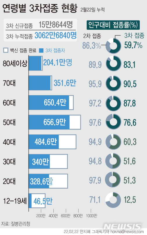 [서울=뉴시스] 22일 0시 기준 전체 인구(5131만7389명·2021년 12월 주민등록 거주자 인구) 대비 3차 백신 접종률은 59.7%다. 18세 이상 성인 중 69.1%, 60세 이상 고령자 중 87.8%가 3차 접종에 참여했다. (그래픽=안지혜 기자)