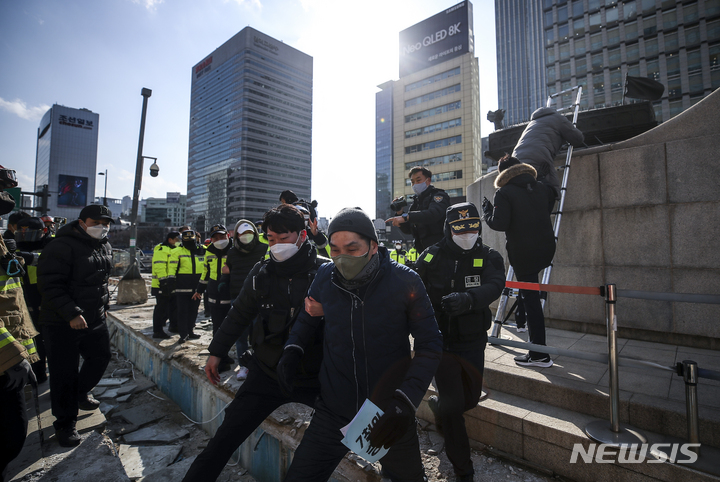 [서울=뉴시스] 정병혁 기자 = CJ대한통운 택배노동자들이 22일 오후 서울 종로구 이순신동상 위에서 CJ대한통운에 대화를 촉구하며 기습시위를 하던 도중 경찰에 연행되고 있다. 2022.02.22. [email protected]
