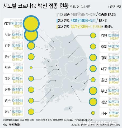 [서울=뉴시스] 23일 코로나19 예방접종 대응 추진단에 따르면 시도별 누적 3차 접종자 수는 경기도가 793만61명으로 가장 많고, 이어 서울 553만7716명, 부산 196만2702명, 경남 195만7795명 등이다. 지역별로 3차 접종률이 높은 곳은 전남 69.2%로 가장 높다. (그래픽=전진우 기자)