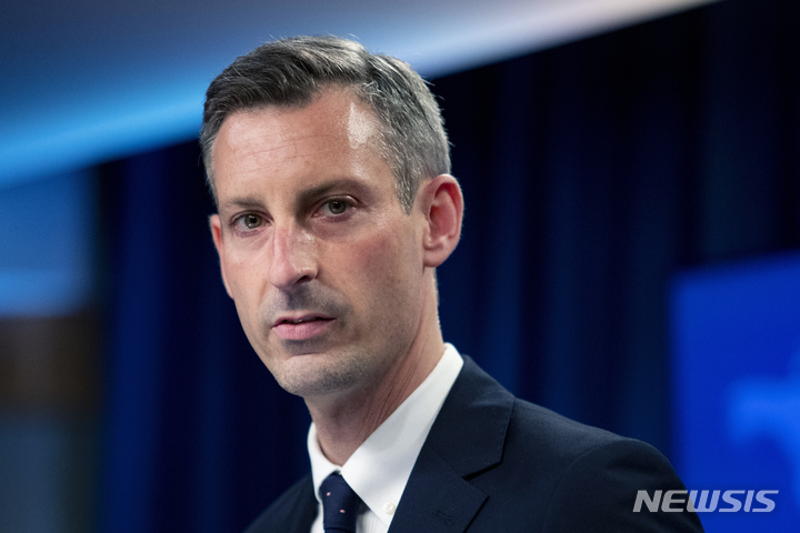 [워싱턴=AP/뉴시스] 네드 프라이스 미 국무부 대변인이 23일(현지시간) 워싱턴 국무부에서 브리핑하고 있다. 프라이스 대변인은 "우리는 러시아의 우크라이나 침공이 잠재적으로 임박했다고 말해 왔다"라며 "이는 (침공이) 오늘도 시작될 수 있다는 의미"라고 말했다. 2022.02.24.