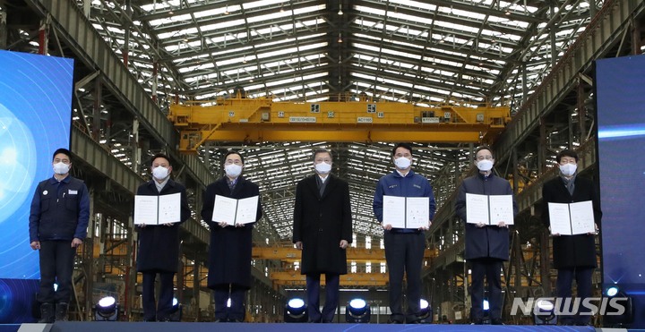 [군산=뉴시스] 김진아 기자 = 문재인 대통령이 24일 전북 군산시 현대중공업 군산조선소에서 열린 군산조선소 재가동 협약식에서 협약식을 마친 뒤 기념촬영을 하고 있다. 왼쪽부터 정병천 현대중공업 노조지부장, 강임준 군산시장, 문승욱 산업통상자원부 장관, 문 대통령, 한영석 현대중공업 대표이사, 송하진 전북도지사, 안경덕 고용노동부 장관. 2022.02.24. [email protected]
