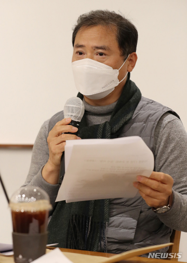 [서울=뉴시스] 김선웅 기자 = KBS 최철호 PD가 24일 오후 서울 여의도의 한 카페에서 이재명 더불어민주당 대선 후보가 선거 공보물에 기재된 '검사 사칭' 전과 기록에 대해 '방송PD가 물어서 알려준 것'이라고 소명한 것과 관련해 기자회견을 하고 있다. (공동취재사진) 2022.02.24. [email protected]