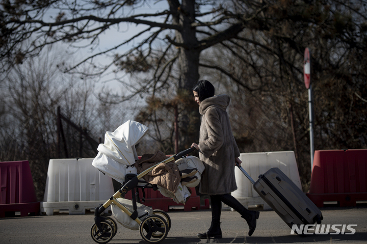 [시레트=AP/뉴시스] 25일(현지시간) 한 우크라이나 여성이 유모차를 밀면서 우크라이나와의 접경 지역인 루마니아 시레트에 도착하고 있다. 북쪽으로 우크라이나와 약 600㎞에 이르는 국경을 접하고 있는 루마니아에 우크라이나 피난민이 급증하는 것으로 알려졌다. 2022.02.26.