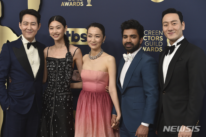 [샌타모니카=AP/뉴시스] 넷플릭스 한국 드라마 오징어 게임의 배우 이정재, 정호연, 김주령, 아누팜 트리파티, 박해수(왼쪽부터)가 27일(현지시간) 미 캘리포니아주 샌타모니카의 바커 행어에서 열리는 제28회 미국배우조합상(SAG) 시상식에 도착해 포토타임을 갖고 있다. 2022.02.28.