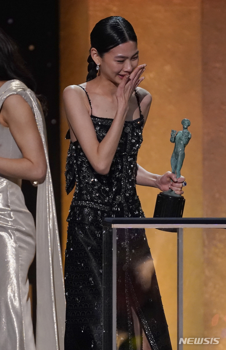 [샌타모니카=AP/뉴시스] 배우 정호연이 27일(현지시간) 미 캘리포니아주 샌타모니카의 바커 행어에서 열린 제28회 미국배우조합상(SAG) 시상식에서 넷플릭스 한국 드라마 '오징어 게임'으로 최우수 여우 주연상을 받고 눈물을 흘리며 기뻐하고 있다. 2022.02.28.